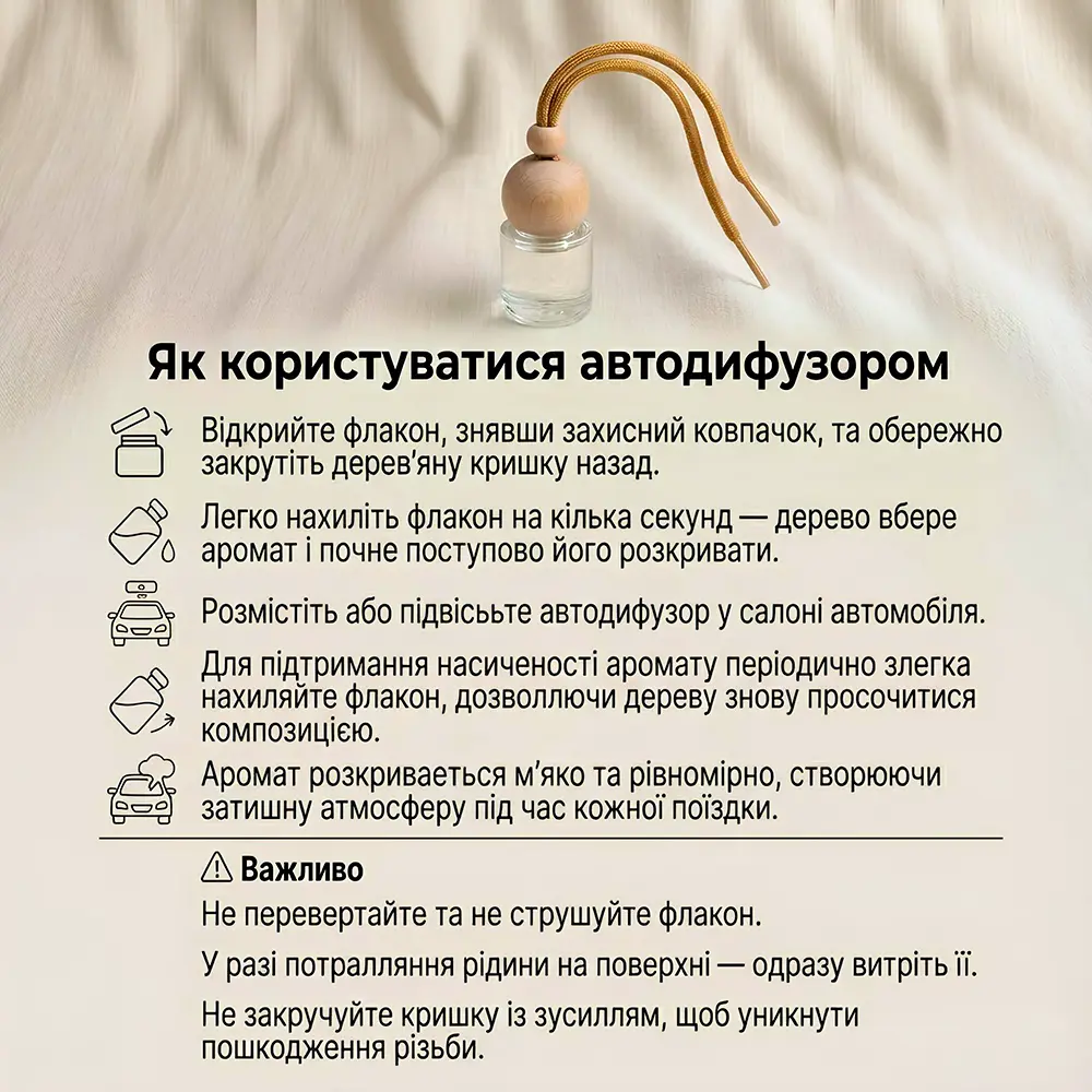 Ви можете обирати улюблені аромати та за необхідності доливати рідину у флакон. Ідеально підходить для щоденного використання, забезпечує відчуття свіжості, усуває неприємні запахи та надає салону індивідуальності.