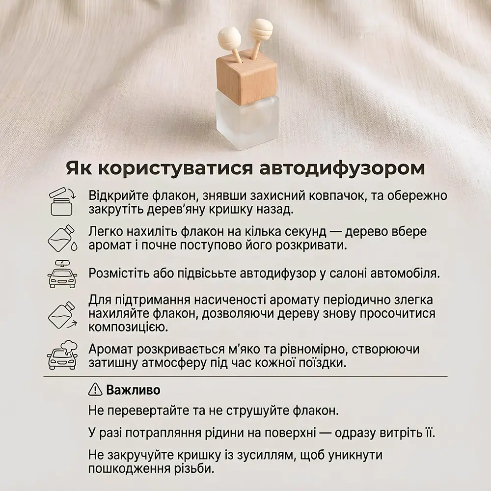 Дифузор створює приємний, ненав’язливий аромат під час поїздок, допомагає позбутися неприємних запахів і перетворює кожну дорогу на атмосферну та комфортну подорож. Ароматичні палички забезпечують поступове, тривале розкриття аромату без різких запахів та аерозолів. На задній частині дифузора розташована надійна кліпса-зажим, яка легко кріпиться на вентиляційну решітку автомобіля.