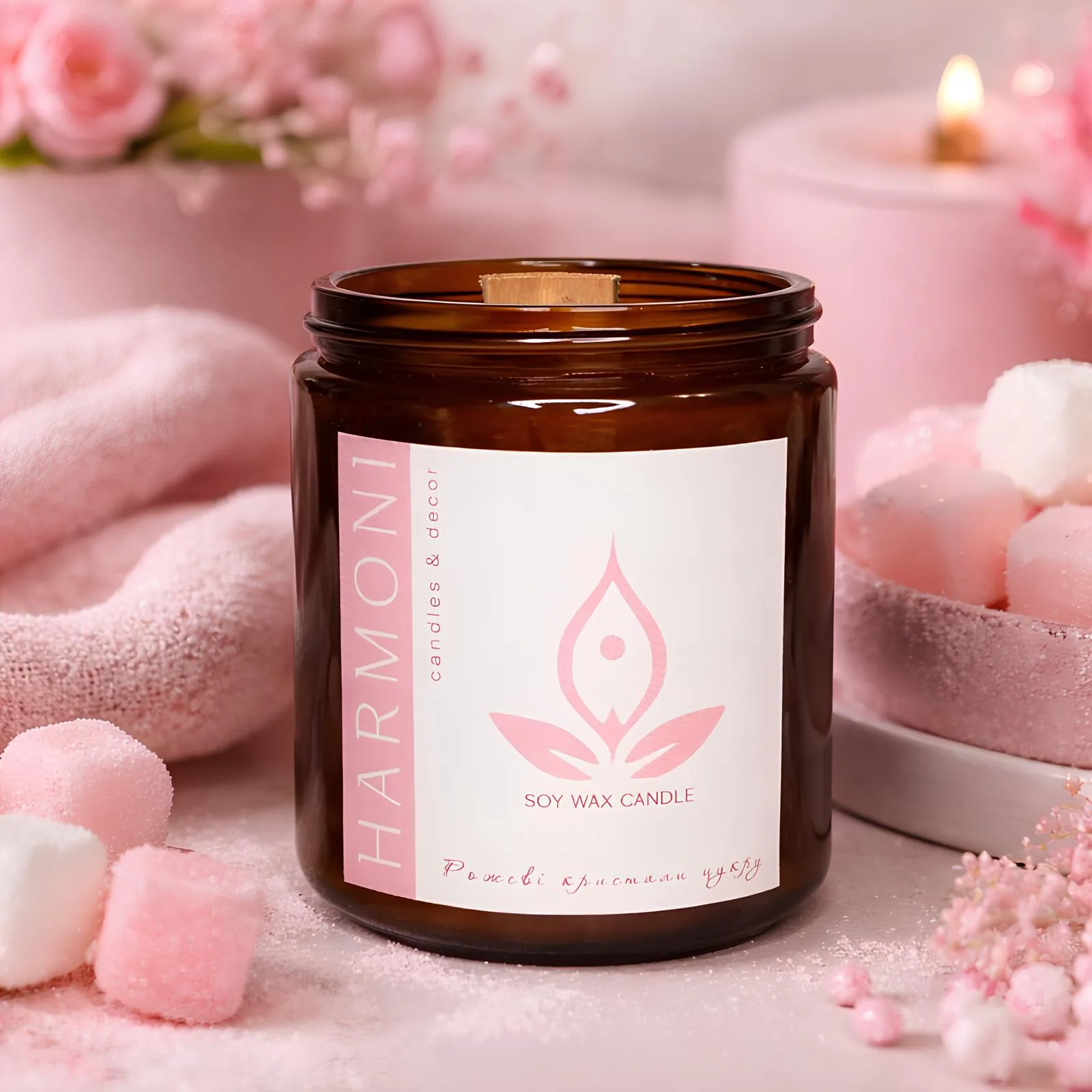 Справжня окраса вашого вечора — велика свічка HARMONI Amber Maxi у глибокому темному склі, що випромінює спокій та впевненість. Ми поєднали натуральний соєвий віск із широким дерев’яним ґнотом, який під час горіння ніжно потріскує, створюючи ілюзію маленького каміна прямо у вашій кімнаті. Преміальні аромаолії з міжнародними сертифікатами якості розкриваються поступово, огортаючи простір благородним ароматом. Золотиста кришка надійно захищає віск від пилу та зберігає інтенсивність парфумерної композиції, роблячи цю свічку ідеальним вибором для тих, хто цінує тривалий затишок та естетику крафту.